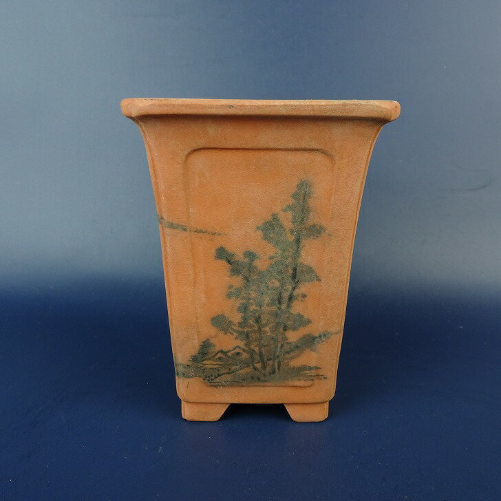 【中古】盆栽鉢 文山 小型 高さ 約11cm 正方鉢 外縁 窓入 墨絵 風景画 泥鉢 観賞用 現品 中古鉢