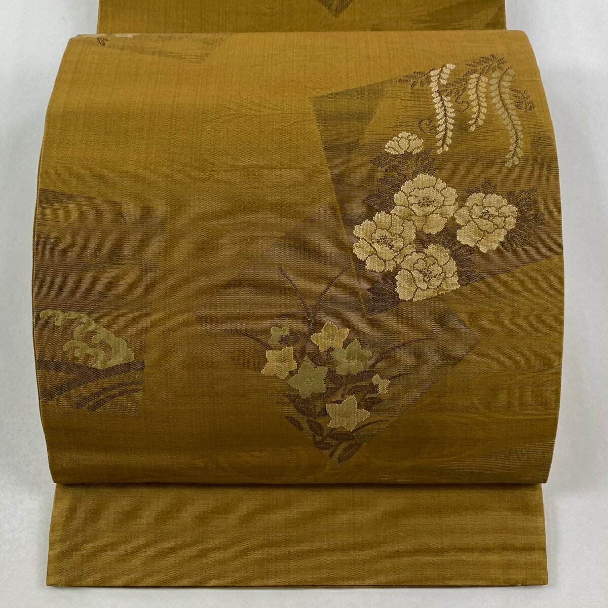 袋帯 秀品 紬地 色紙 草花 山吹茶色 六通 正絹 【中古】