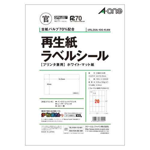 エーワン 再生紙ラベル プリンタ兼用 マット紙 A4 20面 100枚 RL20A-100-KAN