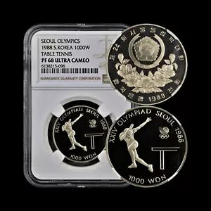 韓国。 1987年、1000ウォン - NGC PF68 - ソウルオリンピック、卓球、卓球、韓国