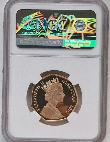 エリザベス2世記念金貨プルーフ50ペンス、NGC PG69、2007年フォークランド紛争。15.5gr金貨