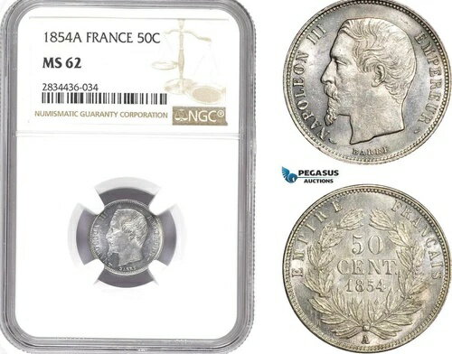 AD846、フランス、ナポレオン 3 世、50 サンタイム 1854-A、パリ、シルバー、NGC MS62
