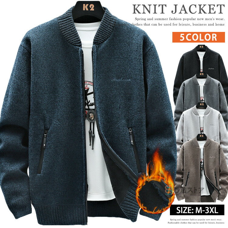 ニット カーディガン メンズ 長袖 厚手 ブルゾン スタンドカラー ケーブル編み フロントジップ 秋冬 暖かい カジュアル