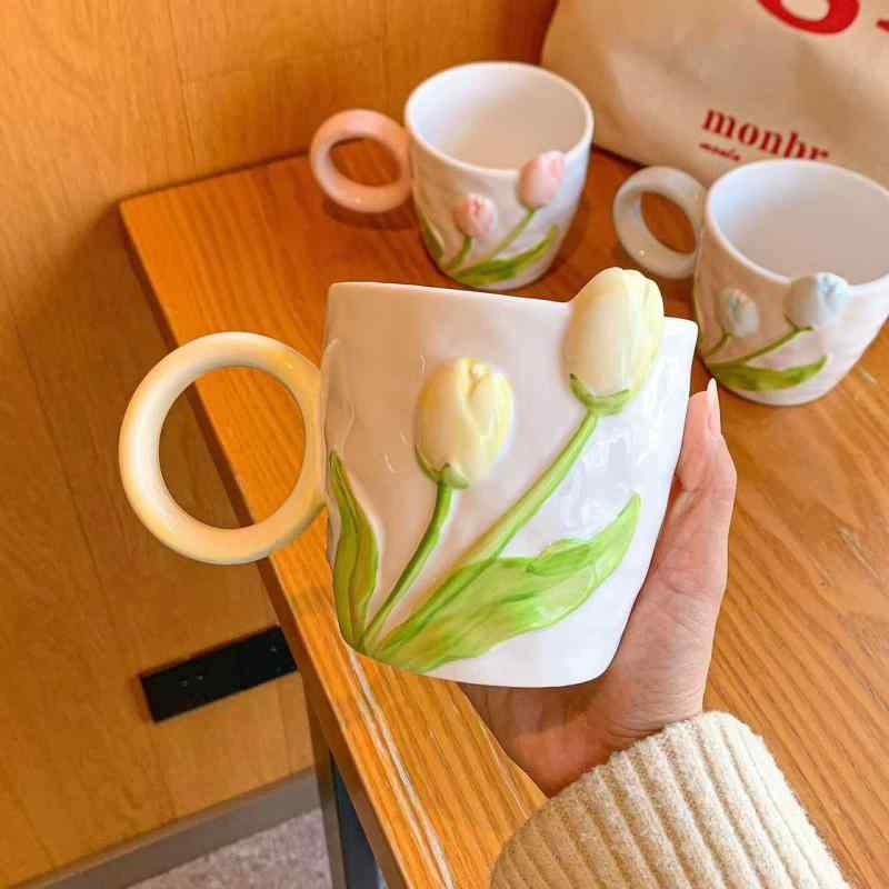 マグカップ レディース 女性 女友達 贈り物 チューリップ柄 セラミック 301-400ml ピンク系 ブルー イエロー