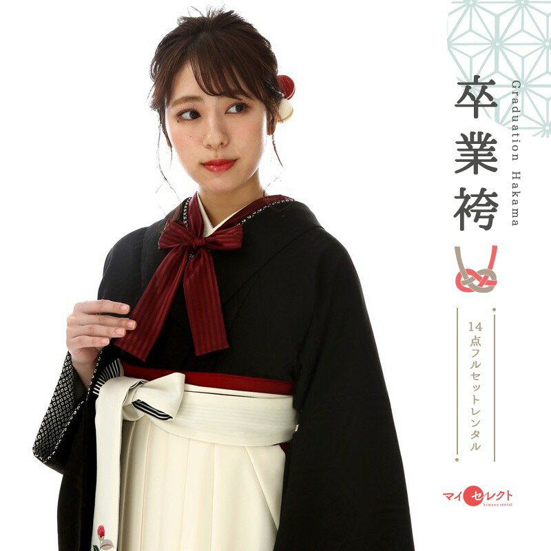 【レンタル】卒業式(高校/大学) 袴セット 17点フルセット 二尺袖(黒地に紫の菊と梅)+袴 選べる4サイズ S/M/L/LL A7AG