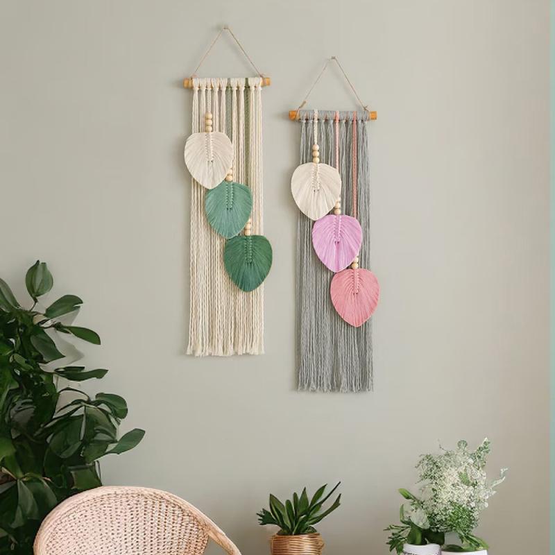 タペストリー 壁掛け 北欧風 綿 手編み リーフ柄 葉 部屋飾り リビング 寝室 ピンク系 グリーン