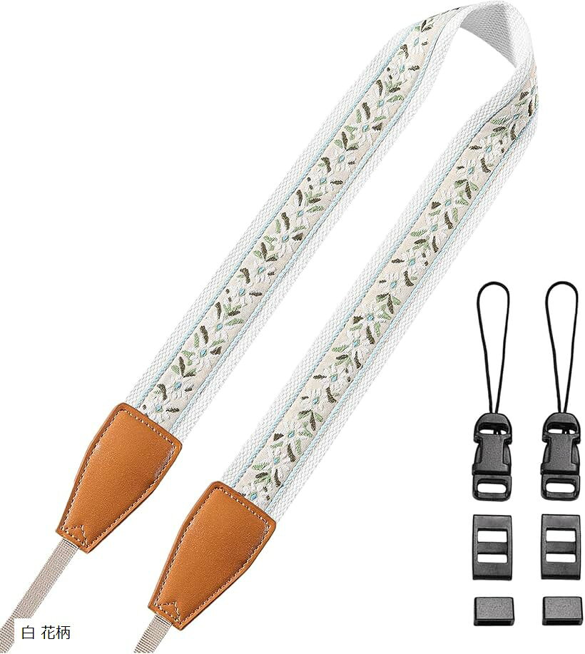 カメラ ストラップ ネックストラップ ボヘミアン 刺繍 首掛け 一眼レフ ショルダー (白 花柄)