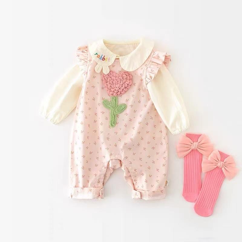 ベビー服 女の子 春物 小花柄 長袖 ロンパース パンツ 上下セット 綿 ピンク系 新生児 赤ちゃん 幼児 普段着 かわいい 韓国風