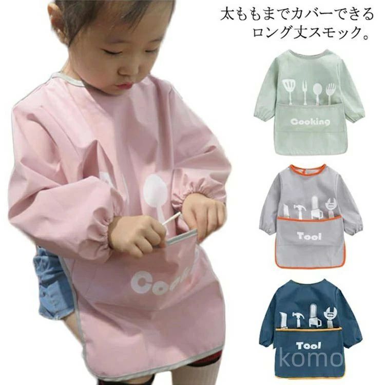 【送料無料】ポケットつき 子ども 子供 女の子 男の子 キッズ お食事エプロン ロング 汚れ防止 防水 長袖スモック ロング丈スモック