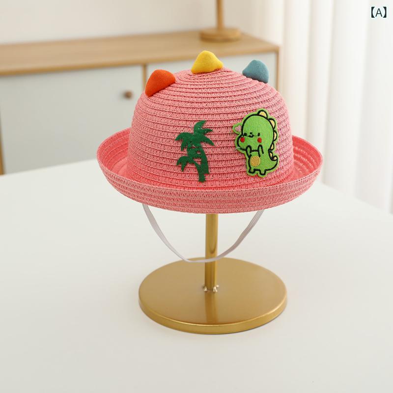 麦わら帽子 キッズ 子供 カートゥーン 恐竜 ラウンド クラッチバッグ セット 2歳 3歳 4歳 5歳 6歳 日よけ 通気性 ベージュ系