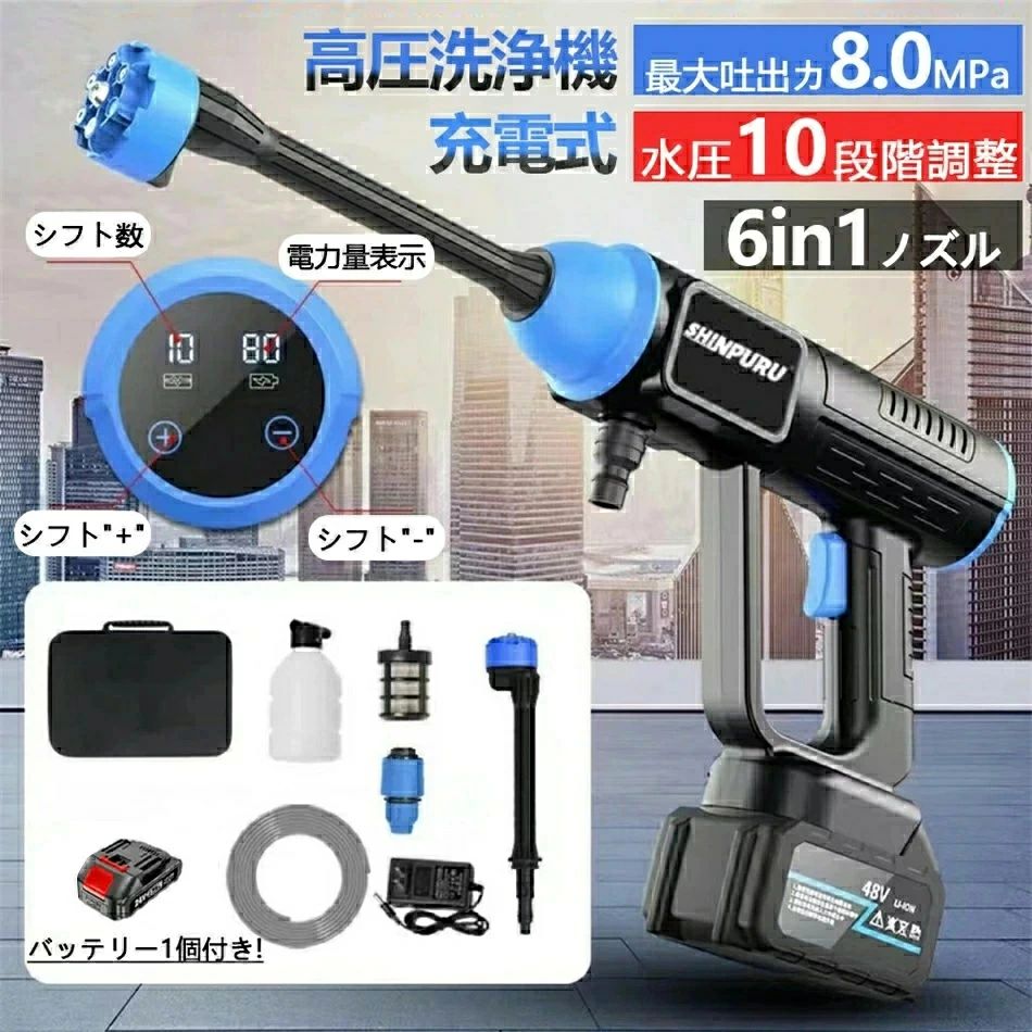 水圧洗浄機 電力量表示 6IN1 8MPa 充電式 コードレス 高圧洗浄機