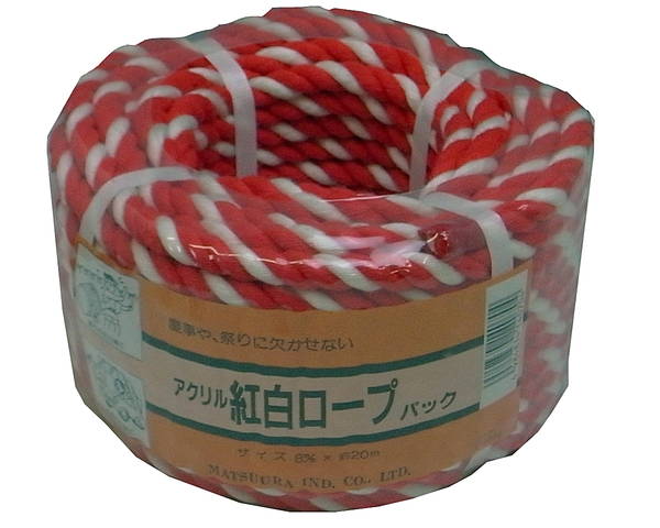アクリル紅白ロープ 約8ミリX20M 丸巻パック【まつうら工業】