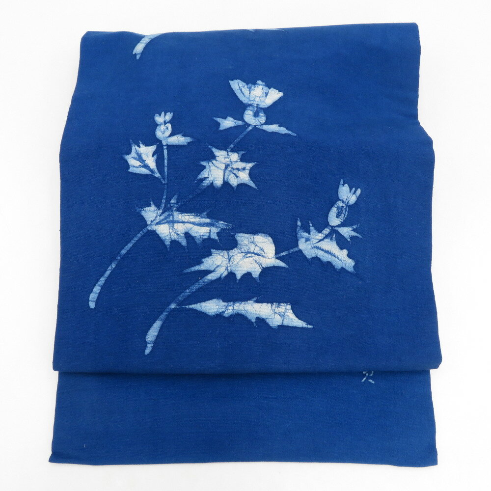 名古屋帯 青色x白色 ろうけつ染め 花文様 お太鼓柄 正絹 落款入り カジュアル 仕立て上がり 着物帯 長さ318cm【中古】