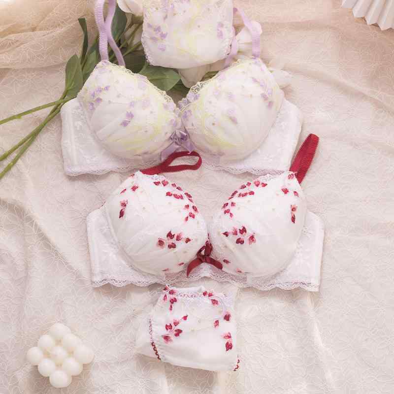 ブラジャー & ショーツ セット レディース 薄手 刺繍入り 谷間メイク 3/4カップ 盛れる バストアップ 快適 レッド パープル