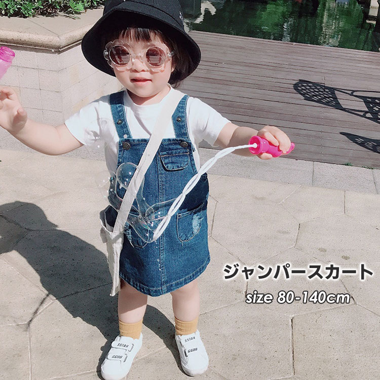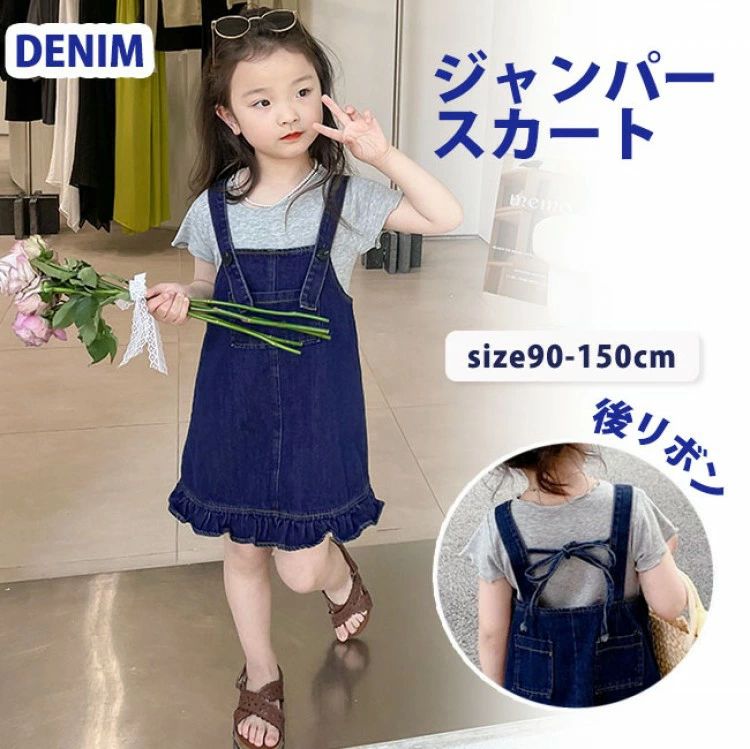 キッズ ジャンパースカート デニム 女の子 子供服 春夏秋 ワンピース かわいい カジュアル ポケット 綿 快適 チェック 猫 青