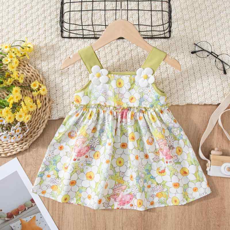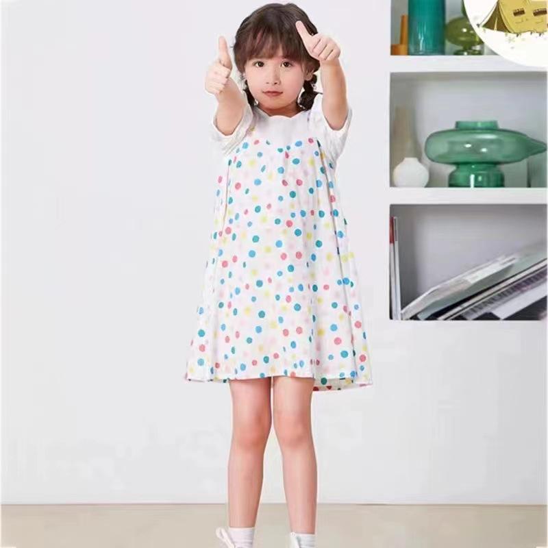 ワンピース 女児用 花柄 Aライン 薄手 半袖 膝丈 コットン 背当て付き 切り替えデザイン ブルードット 春夏