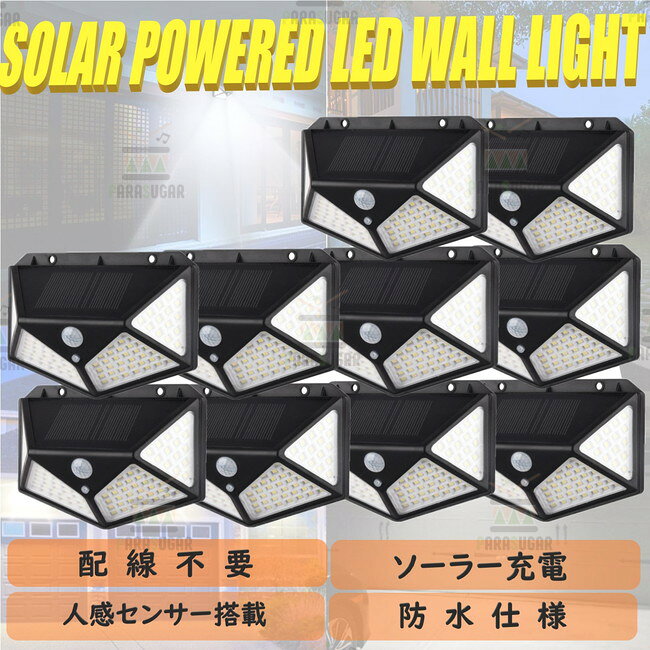 高輝度100LED 4面発光 屋外 ソーラーライト 10個セット ☆ センサーライト 人感センサーライト 防水 広い照明範囲 玄関ライト