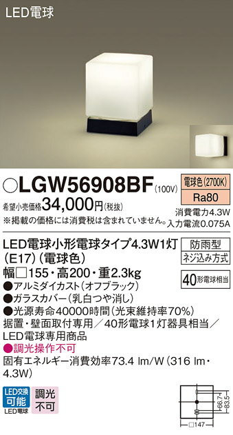 LGW56908BF パナソニック LEDポーチライト 門柱灯 電球色