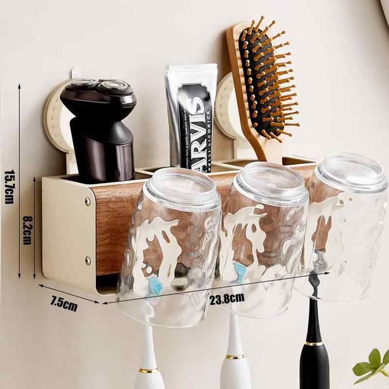 歯ブラシホルダー 壁掛け式 コップ付き 胡桃木 洗面所 収納ラック 電動歯ブラシ 吸盤式 歯ブラシスタンド