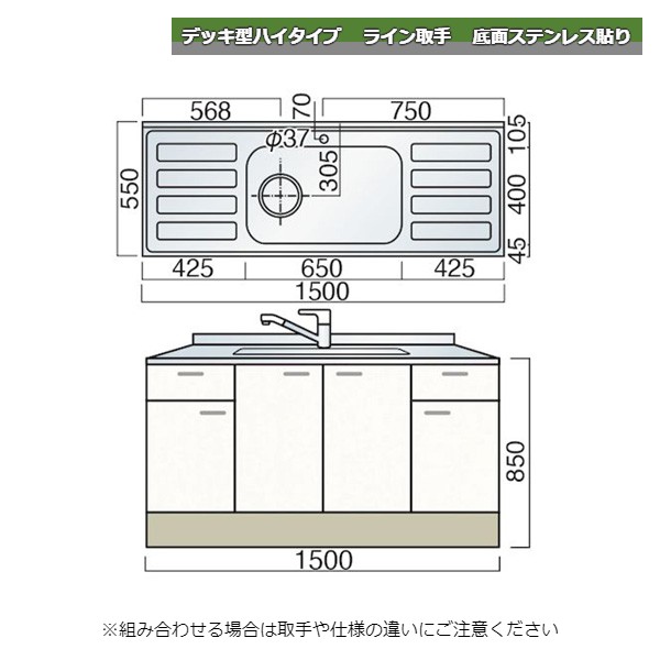 【12月はエントリーでP10倍】 レマン デッキ型ハイタイプ ライン取手 水栓穴あり 中水槽流し台 幅150cm 底面ステンレス貼り キッチン