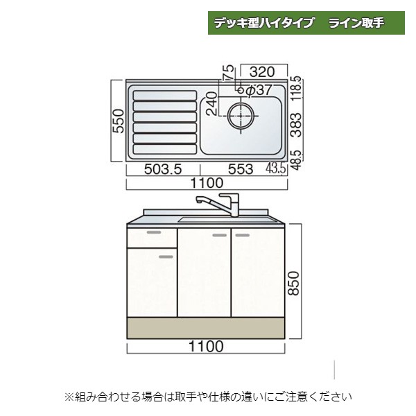 【11月はエントリーでP10倍】 レマン デッキ型ハイタイプ ライン取手 水栓穴あり 水切付流し台 幅110cm キッチン