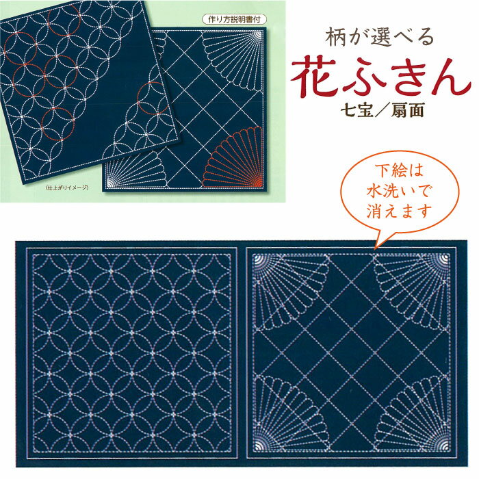 水で消える図案「柄が選べる 花ふきん(藍) 七宝・扇面」刺し子ふきん 布巾 SW380-4A (メール便可)
