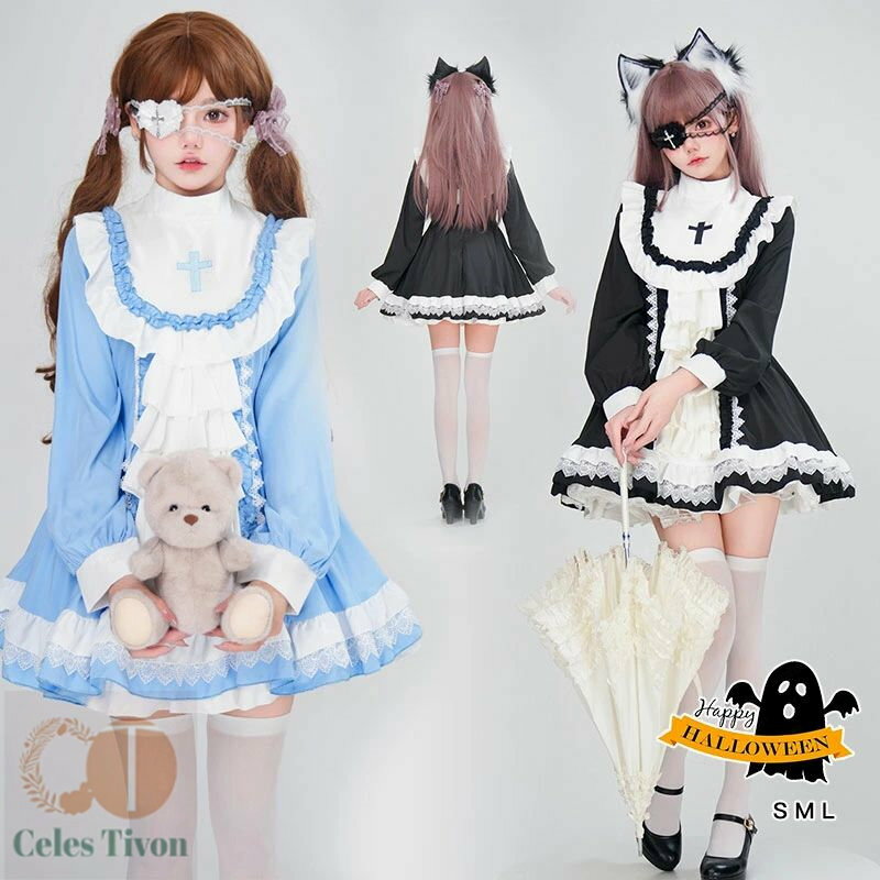 メイド服 コスプレ衣装 大人 ゴシック風 ブルー ブラック アイマスク付き かわいい S M L ハロウィン クリスマス 仮装 男ウケ