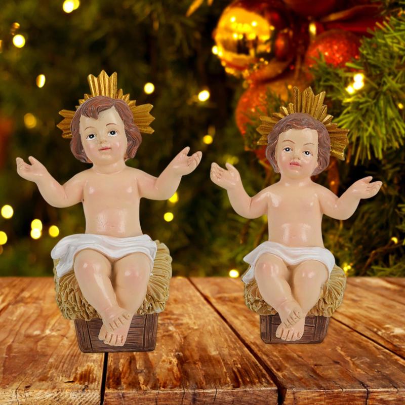王冠付きベビーイエス像.卓上オーナメント.手描きのキリストの子.棚飾り用のキリスト降誕コレクション像