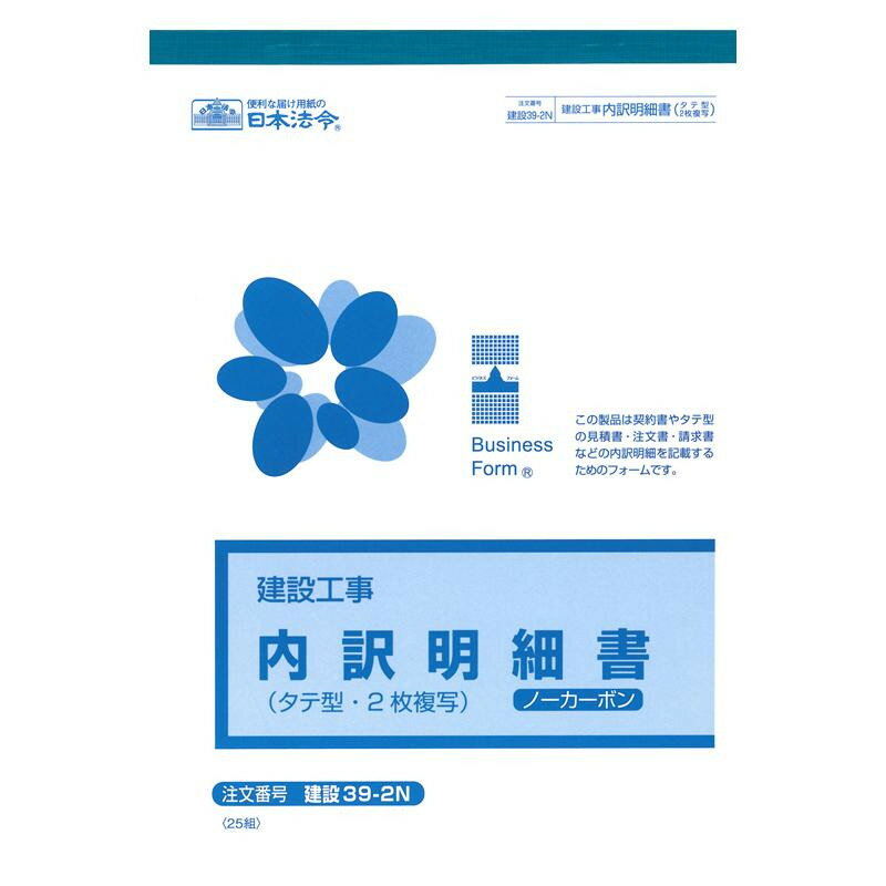 建設 39-2N/(建設工事)内訳明細書(タテ型・ノーカーボン・2枚複写)【送料無料】 メール便対応商品