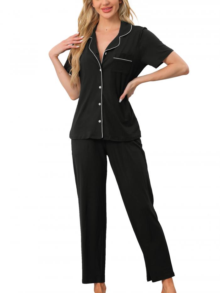 cheibear レディース パジャマセット ボタンダウン ソフト 半袖 寝巻き ロングパンツ 2ピース ラウンジセット 黒 XL