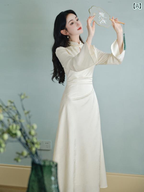 中華風とレトロ民国風を融合したコンセプトの.清涼感と禅の精神を感じさせる白い連衣裝セット。