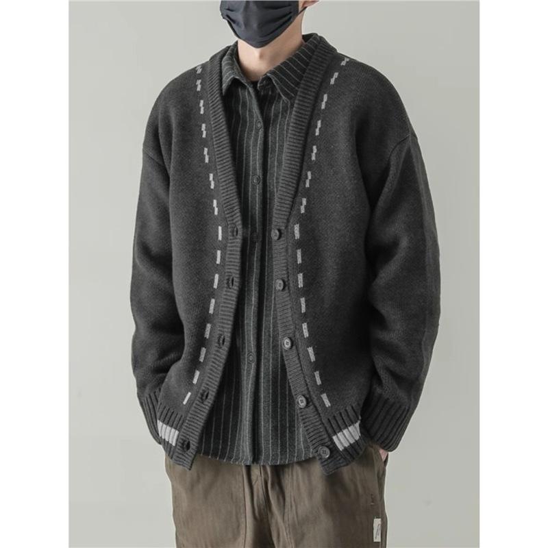 ニット カーディガン メンズ 韓国風 Vネック 長袖 ポリエステル ゆったり カジュアル トップス 秋冬 黒 ブラック グレー カーキ色