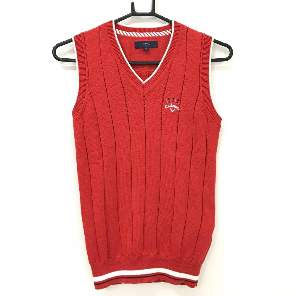 【超美品】キャロウェイ ニットベスト レッド×白 Vネック コットン混 ロゴ刺しゅう レディース M ゴルフウェア Callaway