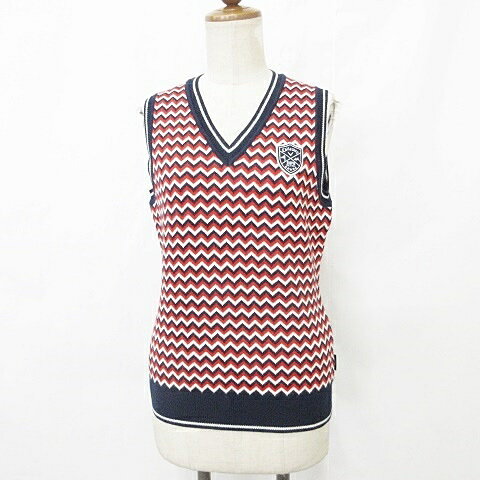 【超美品】キャロウェイ ニットベスト オレンジレッド×ネイビー Vネック ウール混 レディース M ゴルフウェア Callaway