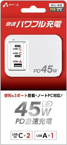エアージェイ PD45W対応 Type-C2ポート/USB1ポート 急速パワフル充電器(ホワイト) air-J AKJ-PD45WH