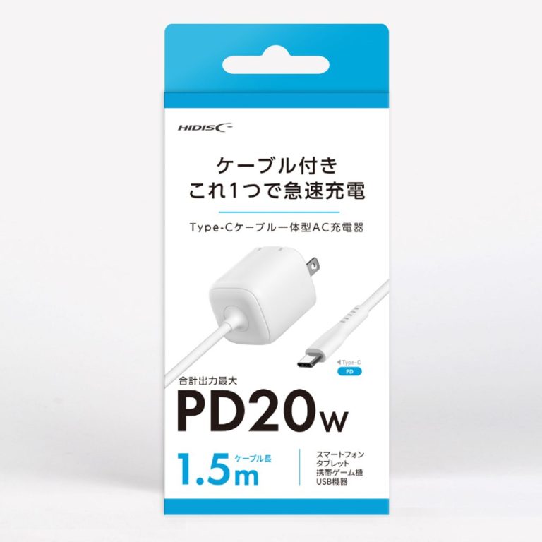 HIDISC Type-Cケーブル一体型AC充電器 PD20Wケーブルと充電器がこれ1つに HD-AC20WC15WH
