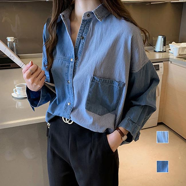 デニムシャツ ストライプ柄 デニム ブラウス トップス 襟付き シャツブラウス レディース