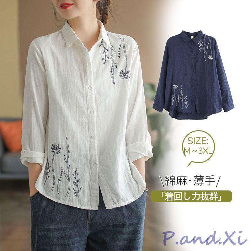 シャツ ブラウス レディース 綿麻 ファッション 刺繍 花柄 長袖 薄手 カジュアル トップス 春 夏 秋 コーデ きれいめ