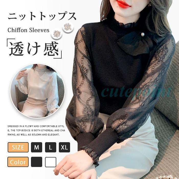 ニットトップス ブラウス レディース シフォン シアースリーブ トップス ぽわん袖 ニット 長袖 透け感 プルオーバー 無地 薄手