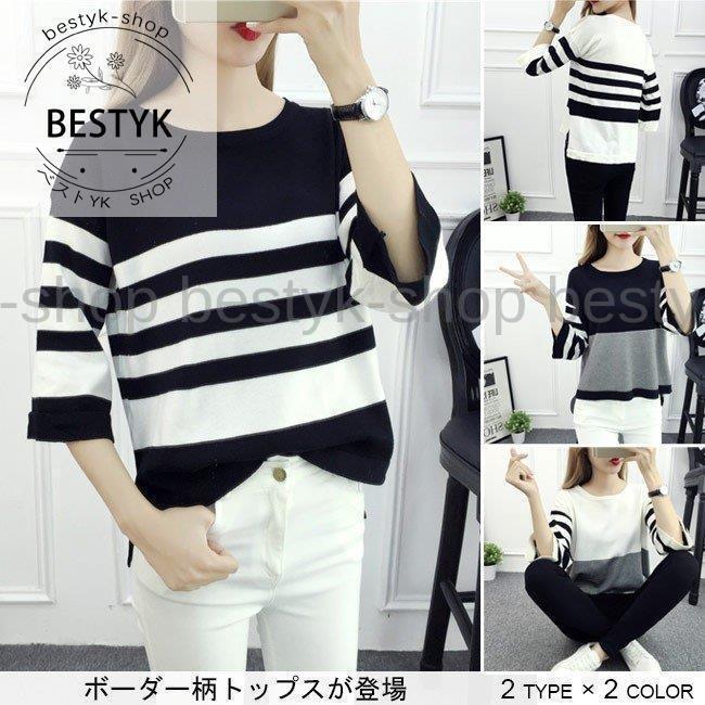 レディース トップス カットソー ニット プルオーバー 七分袖 ボーダー柄 色切り替え 春 シンプル 定番色 ゆったり 学生 カジュアル