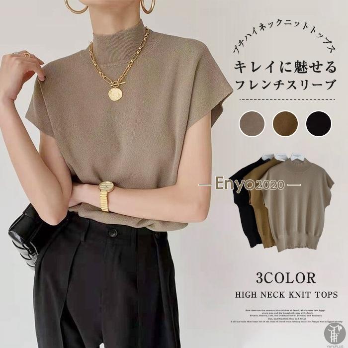 ニット レディース フレンチスリーブ リブニット 半袖 プチハイネック 無地 トップス フラッタースリーブ コーデ 春夏秋 二の腕カバー