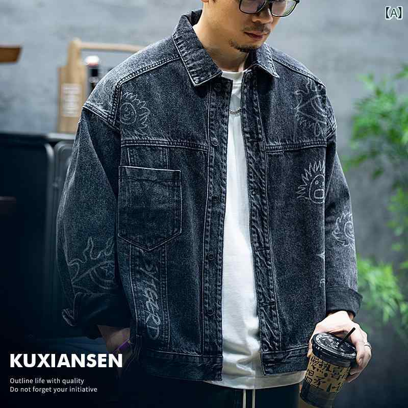 デニムジャケット メンズ Gジャン 秋 ゆったり 長袖 アウター カジュアル 大きめサイズ アメリカン ウォッシュド ロゴ ブラック