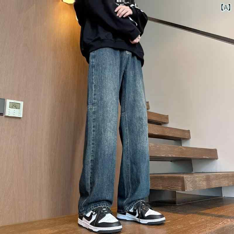 メンズ カジュアル パンツ デニム ストレート ジーンズ レトロ ウォッシュ 加工 ダメージ 長ズボン アメリカ ファッション 裏起毛