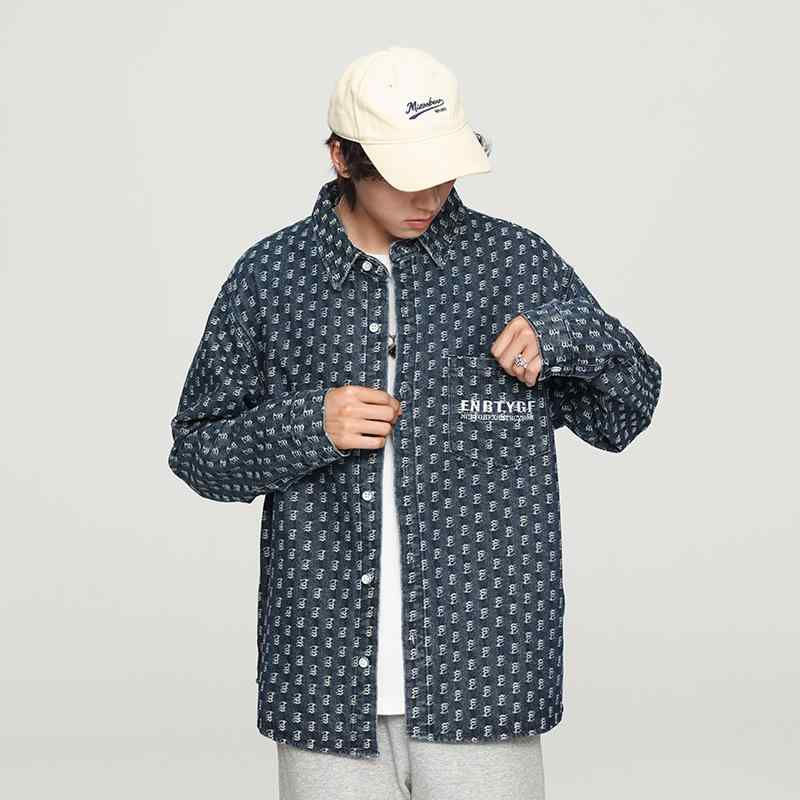 シャツ メンズ デニム 豪華感 満印 刺繡 長袖 宽松 美式 カジュアル ジャケット アウター Gジャン ブラック ブルー 秋