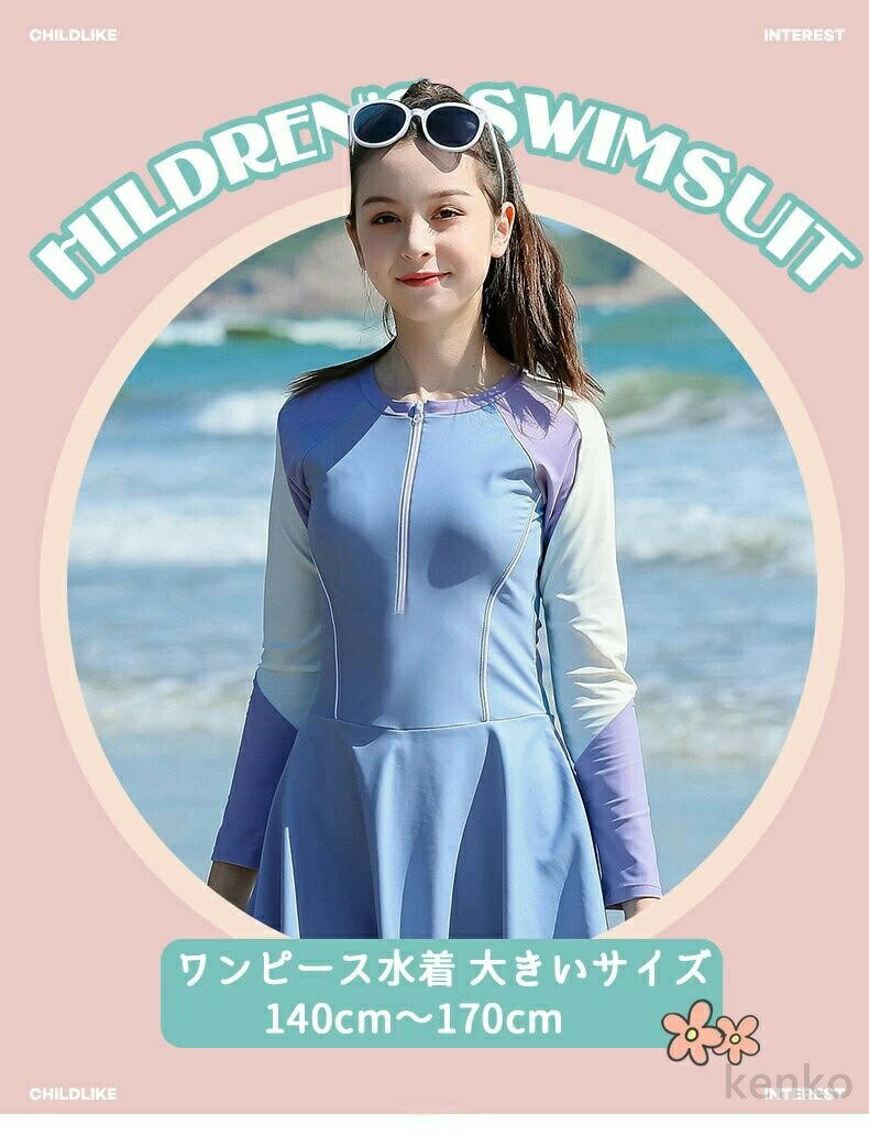 キッズ 水着 男女兼用 長袖 UVカット 速乾 高伸縮 ナイロン ワンピース ラッシュガード シュノーケリング フィットネス プール 海