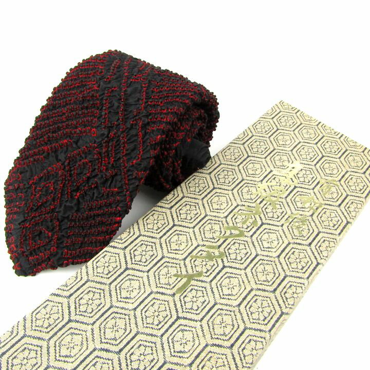 有松絞 ネクタイ 伝統の逸品 手しぼり 和柄 シルク 日本製 メンズ ブラック×レッド necktie 【中古】