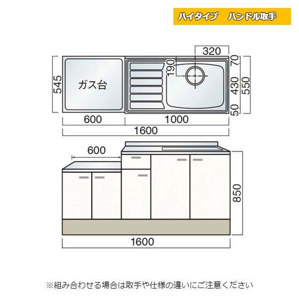 レマン ハイタイプ ハンドル取手 一連式流し台 幅160cm キッチン