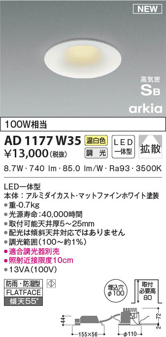 AD1177W35 コイズミ照明 LED防雨防湿ダウンライト 温白色 位相調光 拡散 φ100
