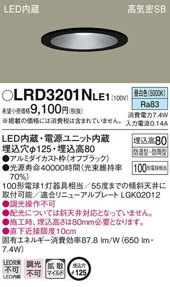LRD3201NLE1 パナソニック 軒下用LEDダウンライト φ125 拡散 昼白色