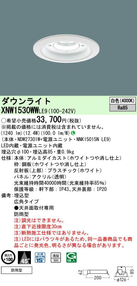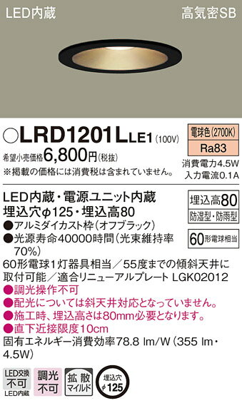 LRD1201LLE1 パナソニック 軒下用LEDダウンライト φ125 拡散 電球色
